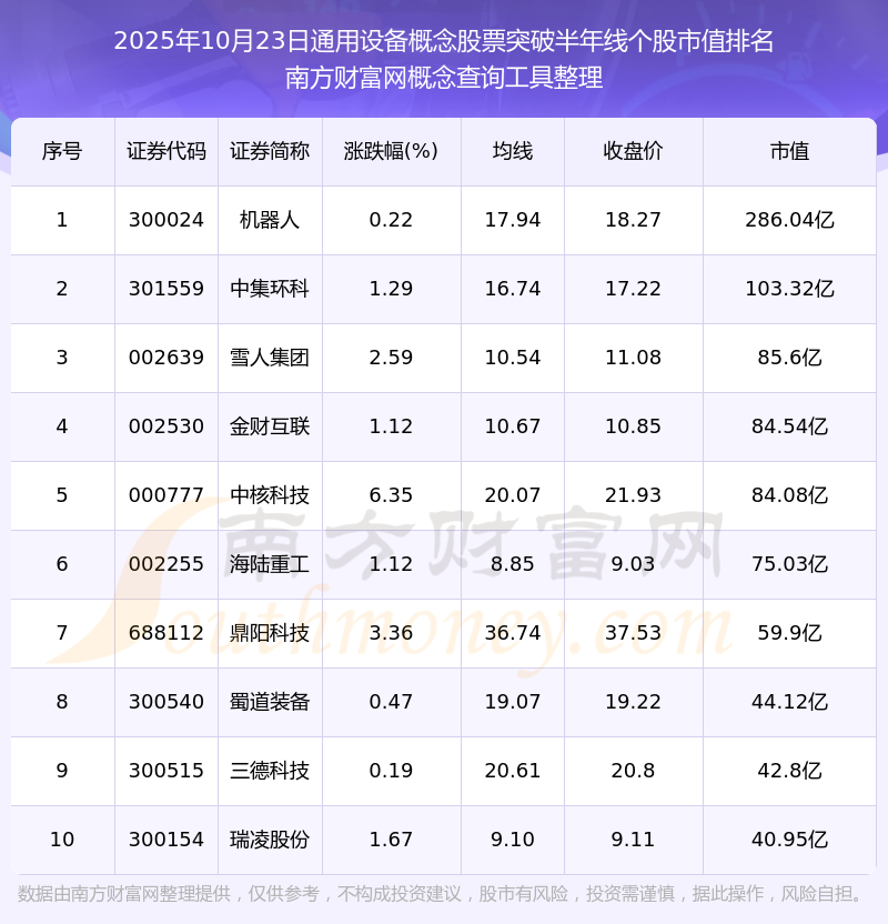 2025年10月23日通用設(shè)備概念股票突破半年線個(gè)股市值排名