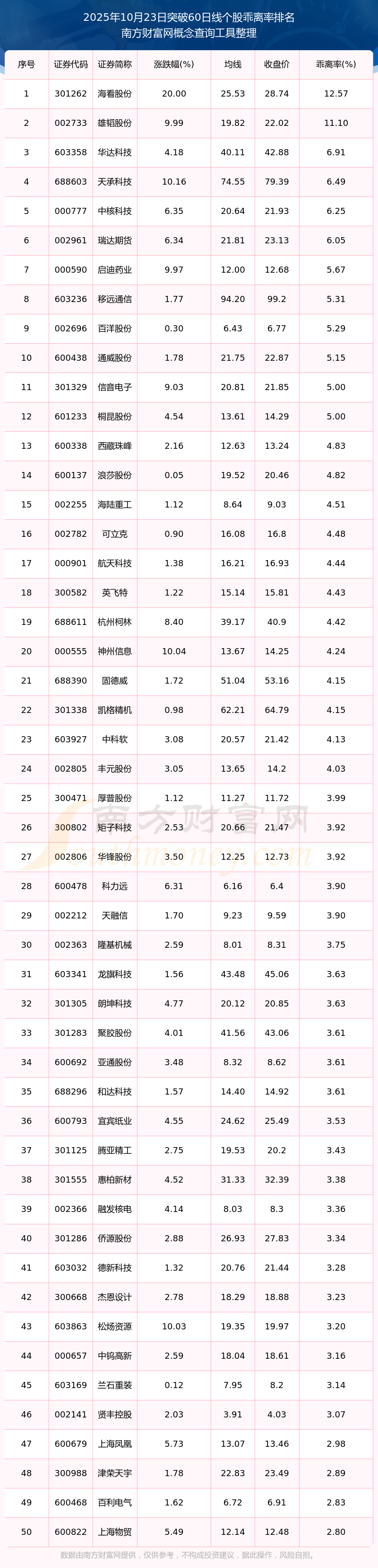 根據(jù)南方財富網(wǎng)概念查詢工具數(shù)據(jù)統(tǒng)計,截止2025年10月23日收盤,共有353只個股收盤價向上突破了60日線,其中乖離率較大的個股有?垂煞、雄韜股份、華達(dá)科技、天承科技、中核科技等,乖離率分別為12.57%、11.10%、6.91%、6.49%、6.25%。