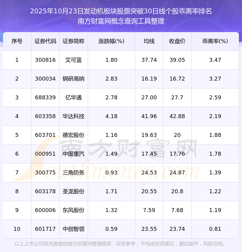2025年10月23日發(fā)動(dòng)機(jī)板塊股票突破30日線個(gè)股乖離率排名