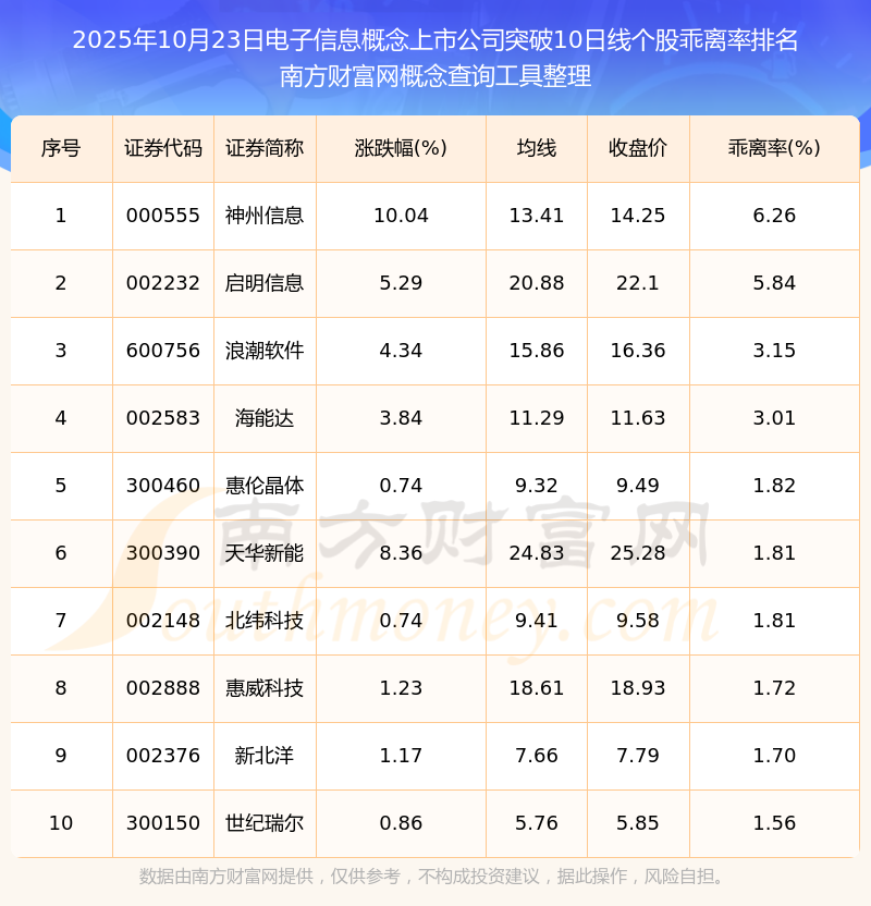 2025年10月23日電子信息概念上市公司突破10日線個股乖離率排名