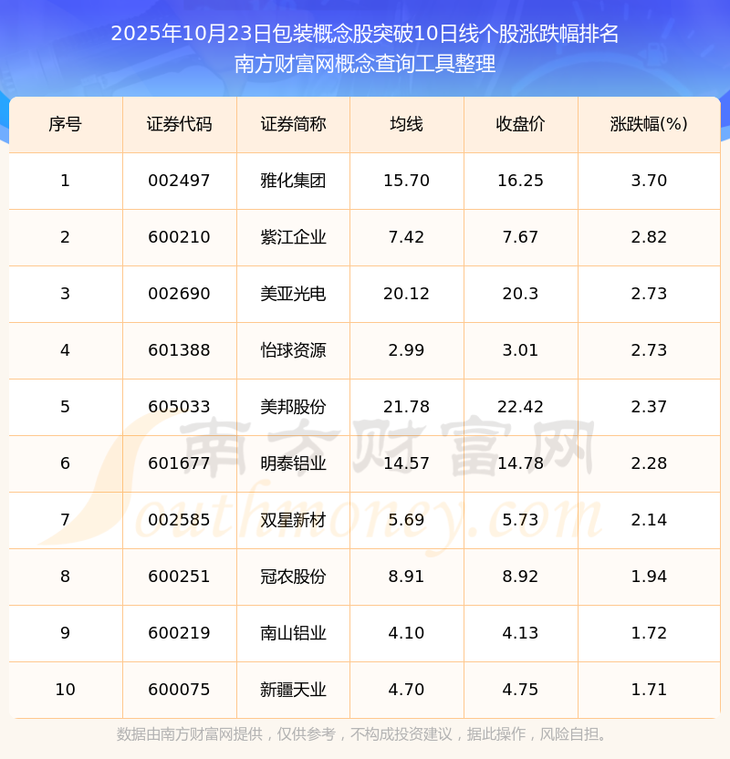 根據(jù)南方財富網(wǎng)概念查詢工具數(shù)據(jù)統(tǒng)計,截止2025年10月23日收盤,包裝概念股共有31只個股收盤價向上突破了10日線。其中漲幅較大的個股有雅化集團、紫江企業(yè)、怡球資源等,漲幅分別為3.70%、2.82%、2.73%。