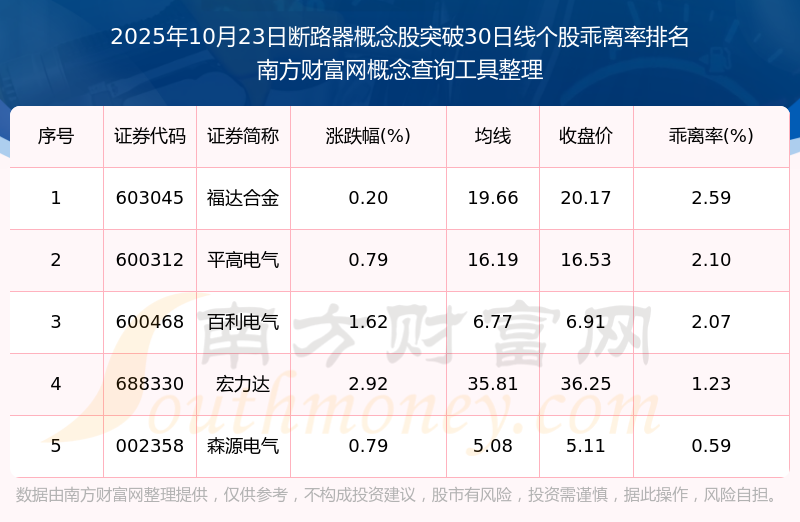 根據(jù)南方財富網(wǎng)概念查詢工具數(shù)據(jù)統(tǒng)計,截止2025年10月23日收盤,斷路器概念股共有5只個股收盤價向上突破了30日線。其中乖離率較大的個股有福達合金、平高電氣、百利電氣等,乖離率分別為2.59%、2.10%、2.07%。