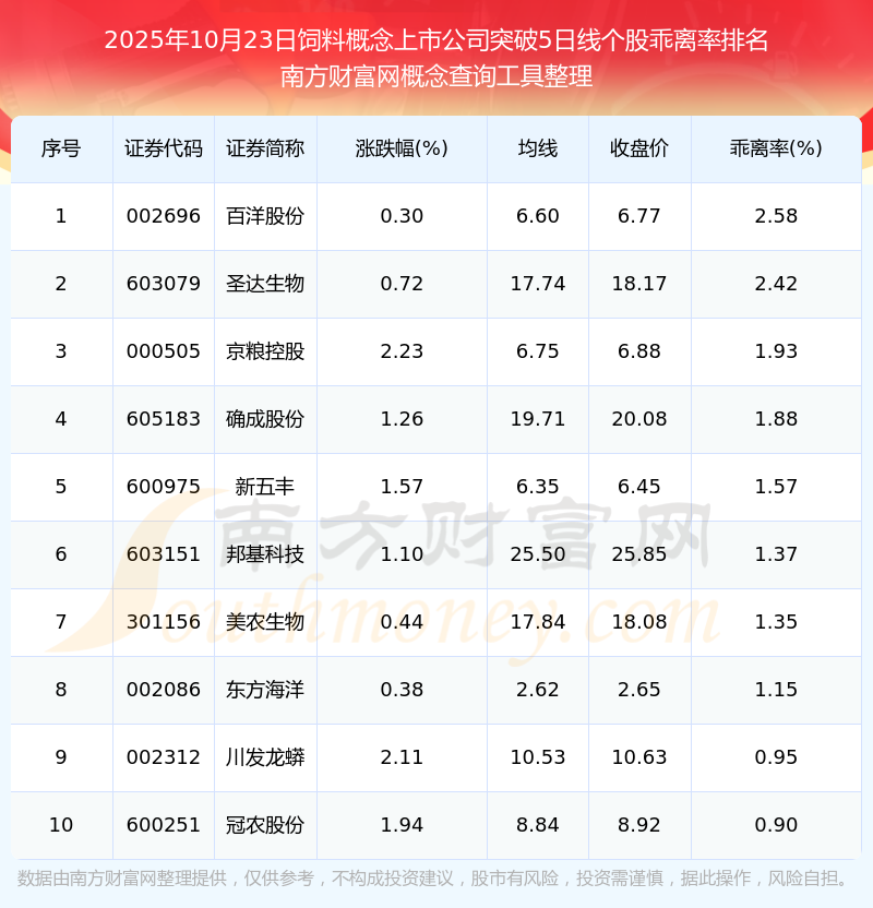 根據(jù)南方財富網(wǎng)概念查詢工具數(shù)據(jù)統(tǒng)計,截止2025年10月23日收盤,飼料概念上市公司共有21只個股收盤價向上突破了5日線。其中乖離率較大的個股有百洋股份、圣達生物、京糧控股等,乖離率分別為2.58%、2.42%、1.93%。