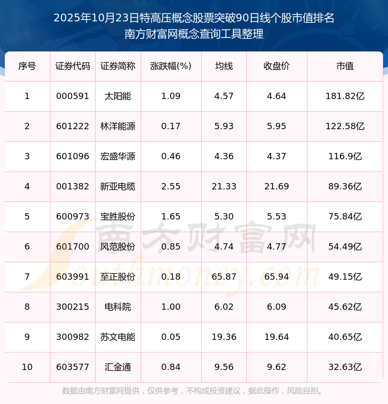 2025年10月23日特高壓概念股票突破90日線個股市值排名
