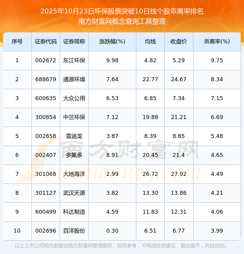 2025年10月23日環(huán)保股票突破10日線個(gè)股乖離率排名