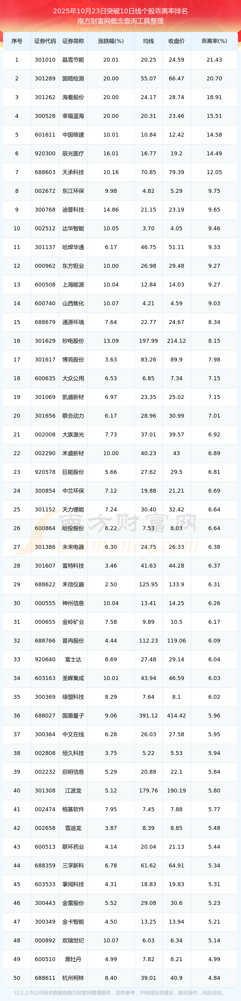 根據(jù)南方財富網(wǎng)概念查詢工具數(shù)據(jù)統(tǒng)計,截止2025年10月23日收盤,共有854只個股收盤價向上突破了10日線,其中乖離率較大的個股有晶雪節(jié)能、國纜檢測、海看股份、幸福藍(lán)海、中國核建等,乖離率分別為21.43%、20.70%、18.91%、15.51%、14.58%。