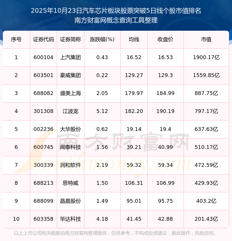 2025年10月23日汽車芯片板塊股票突破5日線個股市值排名