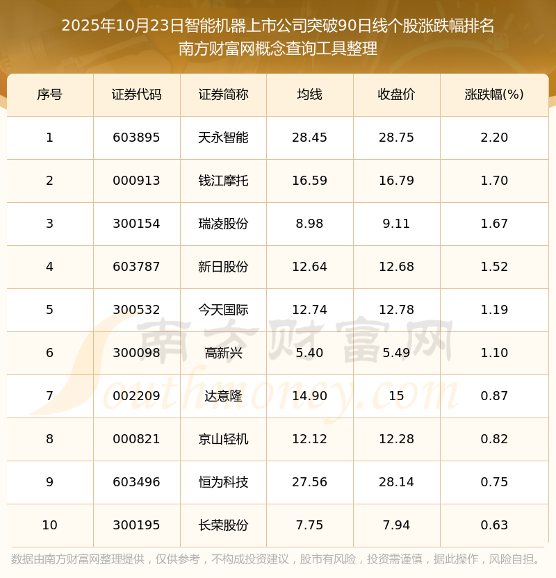 根據(jù)南方財富網(wǎng)概念查詢工具數(shù)據(jù)統(tǒng)計,截止2025年10月23日收盤,智能機器上市公司共有15只個股收盤價向上突破了90日線。其中漲幅較大的個股有天永智能、錢江摩托、瑞凌股份等,漲幅分別為2.20%、1.70%、1.67%。