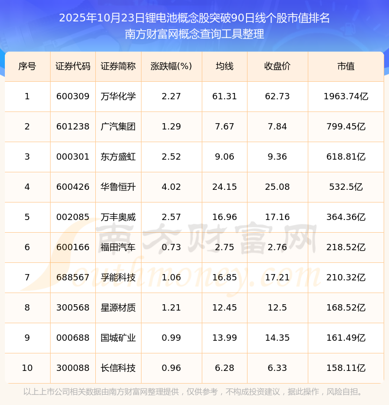 根據(jù)南方財富網(wǎng)概念查詢工具數(shù)據(jù)統(tǒng)計,截止2025年10月23日收盤,鋰電池概念股共有54只個股收盤價向上突破了90日線。其中市值較大的個股有萬華化學(xué)、廣汽集團(tuán)、東方盛虹等,市值分別為1963.74億、799.45億、618.81億。