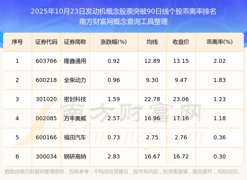 根據(jù)南方財(cái)富網(wǎng)概念查詢工具數(shù)據(jù)統(tǒng)計(jì),截止2025年10月23日收盤,發(fā)動(dòng)機(jī)概念股票共有6只個(gè)股收盤價(jià)向上突破了90日線。其中乖離率較大的個(gè)股有隆鑫通用、全柴動(dòng)力、密封科技等,乖離率分別為2.02%、1.83%、1.23%。