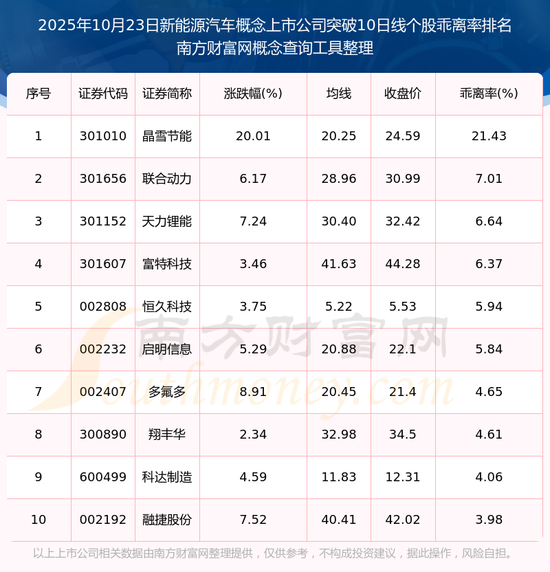 2025年10月23日新能源汽車概念上市公司突破10日線個股乖離率排名