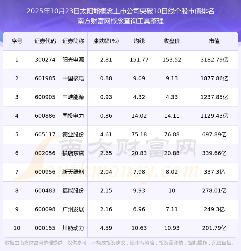 2025年10月23日太陽(yáng)能概念上市公司突破10日線個(gè)股市值排名
