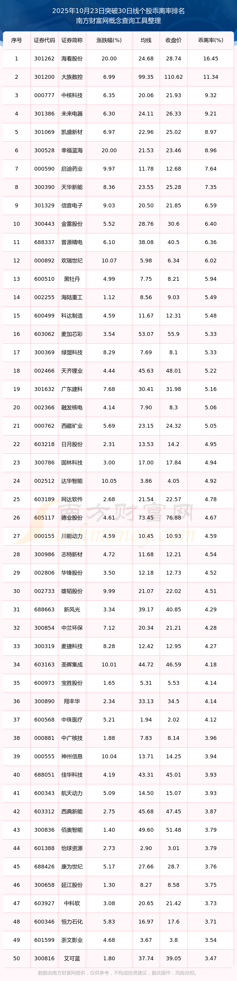 2025年10月23日突破30日線個(gè)股乖離率排名
