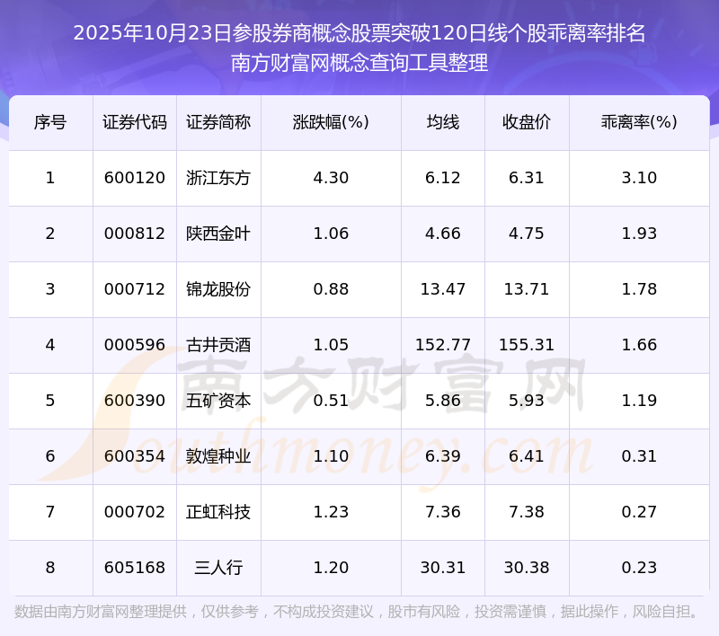 2025年10月23日參股券商概念股票突破120日線個(gè)股乖離率排名