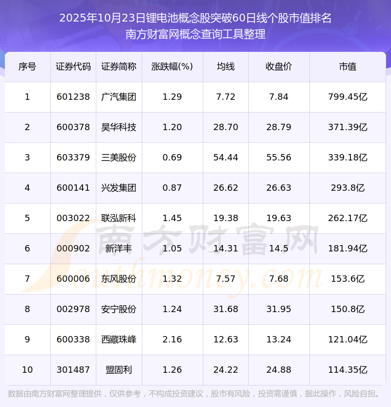 根據(jù)南方財(cái)富網(wǎng)概念查詢工具數(shù)據(jù)統(tǒng)計(jì),截止2025年10月23日收盤,鋰電池概念股共有45只個股收盤價向上突破了60日線。其中市值較大的個股有廣汽集團(tuán)、昊華科技、三美股份等,市值分別為799.45億、371.39億、339.18億。