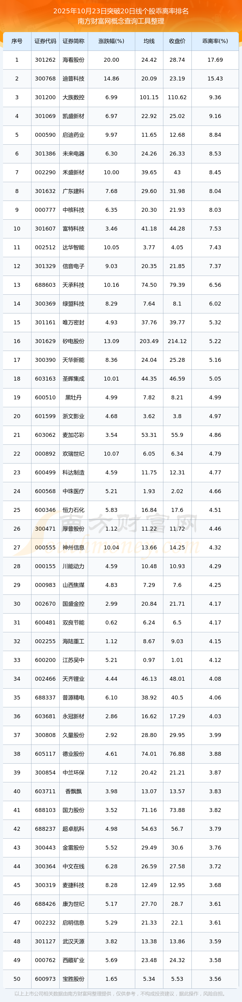 2025年10月23日突破20日線個(gè)股乖離率排名