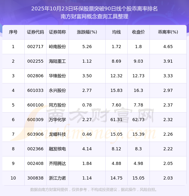 2025年10月23日環(huán)保股票突破90日線個股乖離率排名