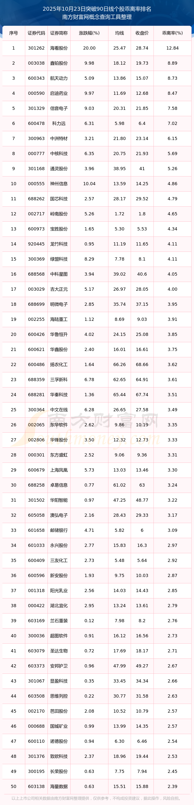 根據(jù)南方財富網(wǎng)概念查詢工具數(shù)據(jù)統(tǒng)計,截止2025年10月23日收盤,共有342只個股收盤價向上突破了90日線,其中乖離率較大的個股有?垂煞荨Ⅵ毋K股份、航天動力、啟迪藥業(yè)、信音電子等,乖離率分別為12.84%、8.89%、8.73%、8.47%、7.58%。