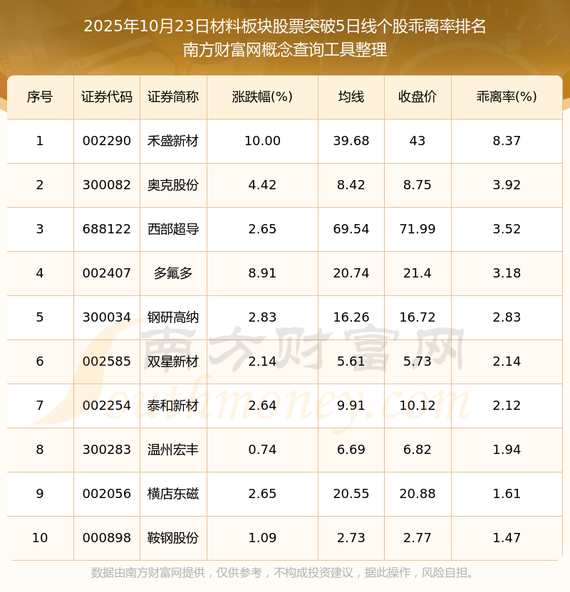 根據(jù)南方財富網(wǎng)概念查詢工具數(shù)據(jù)統(tǒng)計,截止2025年10月23日收盤,材料板塊股票共有26只個股收盤價向上突破了5日線。其中乖離率較大的個股有禾盛新材、奧克股份、西部超導(dǎo)等,乖離率分別為8.37%、3.92%、3.52%。