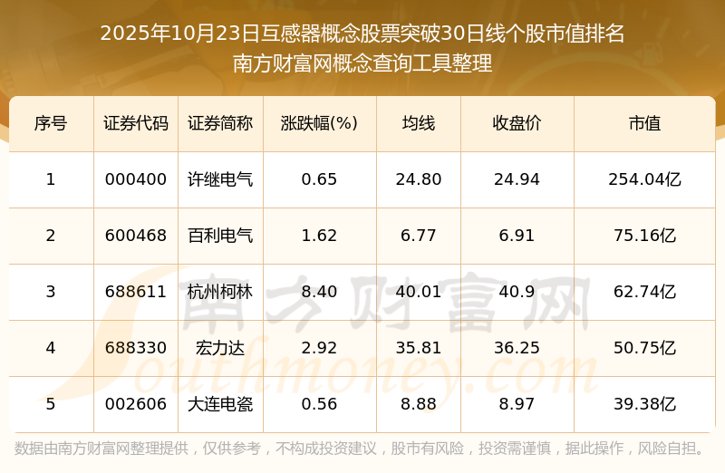 2025年10月23日互感器概念股票突破30日線個(gè)股市值排名
