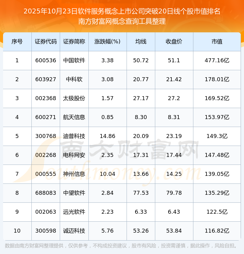 2025年10月23日軟件服務(wù)概念上市公司突破20日線個股市值排名