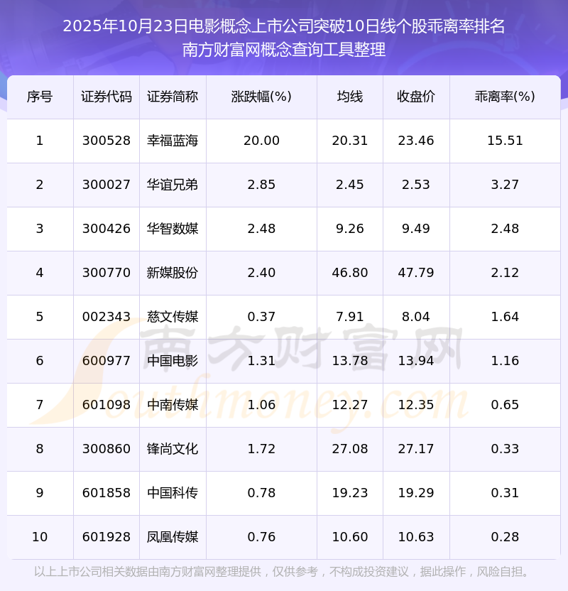 2025年10月23日電影概念上市公司突破10日線個(gè)股乖離率排名