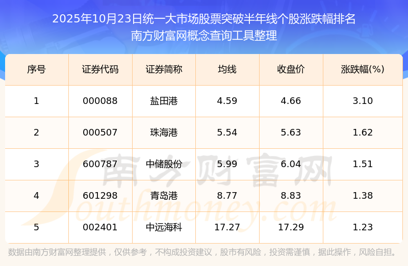 根據(jù)南方財富網概念查詢工具數(shù)據(jù)統(tǒng)計,截止2025年10月23日收盤,統(tǒng)一大市場股票共有5只個股收盤價向上突破了半年線。其中漲幅較大的個股有鹽田港、珠海港、中儲股份等,漲幅分別為3.10%、1.62%、1.51%。