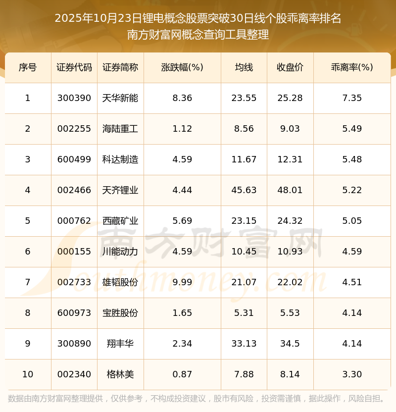 2025年10月23日鋰電概念股票突破30日線個股乖離率排名