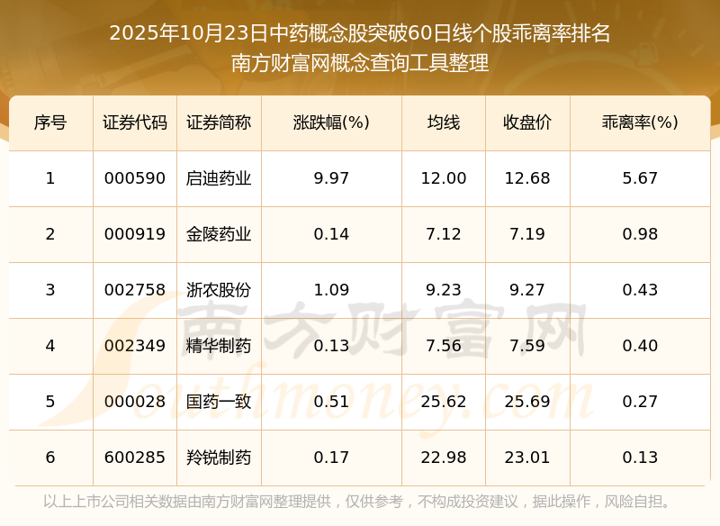 根據(jù)南方財(cái)富網(wǎng)概念查詢工具數(shù)據(jù)統(tǒng)計(jì),截止2025年10月23日收盤,中藥概念股共有6只個股收盤價(jià)向上突破了60日線。其中乖離率較大的個股有啟迪藥業(yè)、金陵藥業(yè)、浙農(nóng)股份等,乖離率分別為5.67%、0.98%、0.43%。