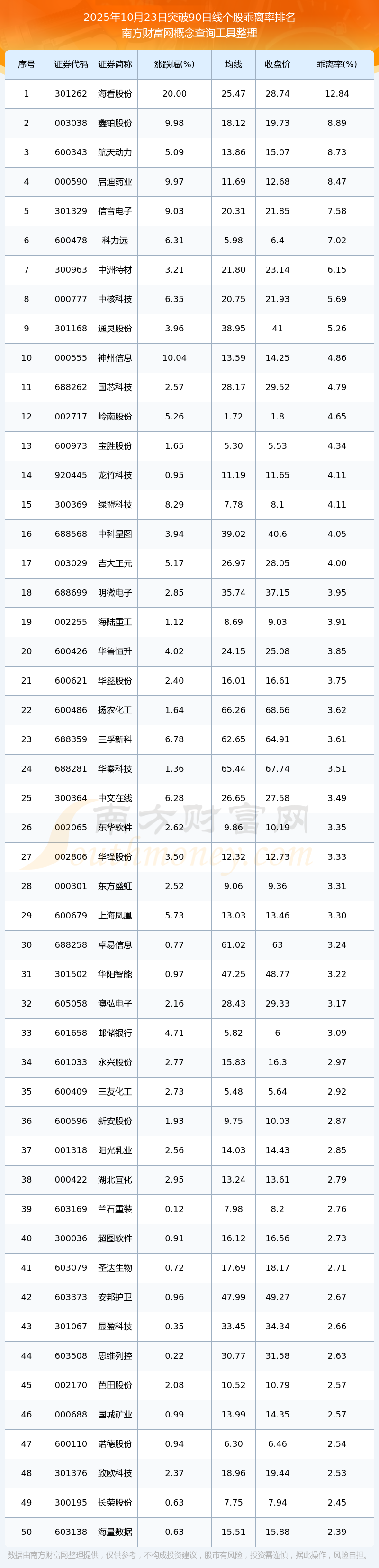 2025年10月23日突破90日線個(gè)股乖離率排名