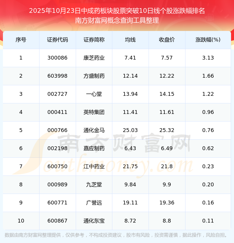 2025年10月23日中成藥板塊股票突破10日線個(gè)股漲跌幅排名