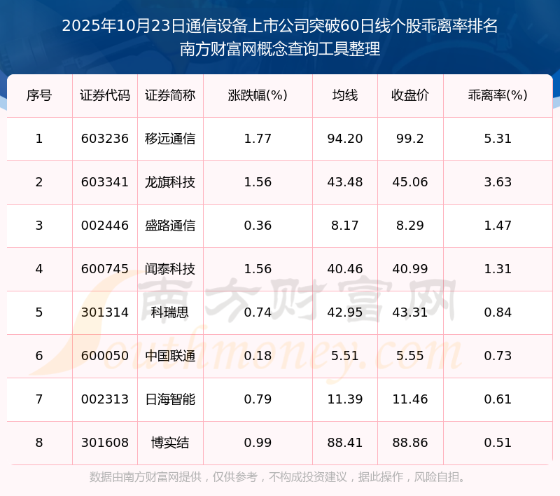 根據南方財富網概念查詢工具數據統(tǒng)計,截止2025年10月23日收盤,通信設備上市公司共有8只個股收盤價向上突破了60日線。其中乖離率較大的個股有移遠通信、龍旗科技、盛路通信等,乖離率分別為5.31%、3.63%、1.47%。
