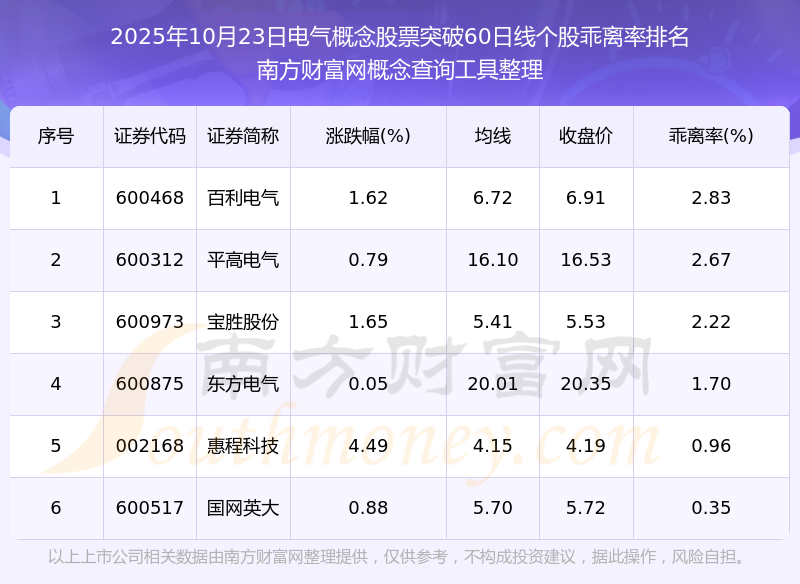 2025年10月23日電氣概念股票突破60日線個股乖離率排名