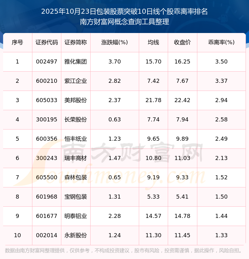 根據(jù)南方財富網概念查詢工具數(shù)據(jù)統(tǒng)計,截止2025年10月23日收盤,包裝股票共有31只個股收盤價向上突破了10日線。其中乖離率較大的個股有雅化集團、紫江企業(yè)、美邦股份等,乖離率分別為3.50%、3.37%、2.94%。
