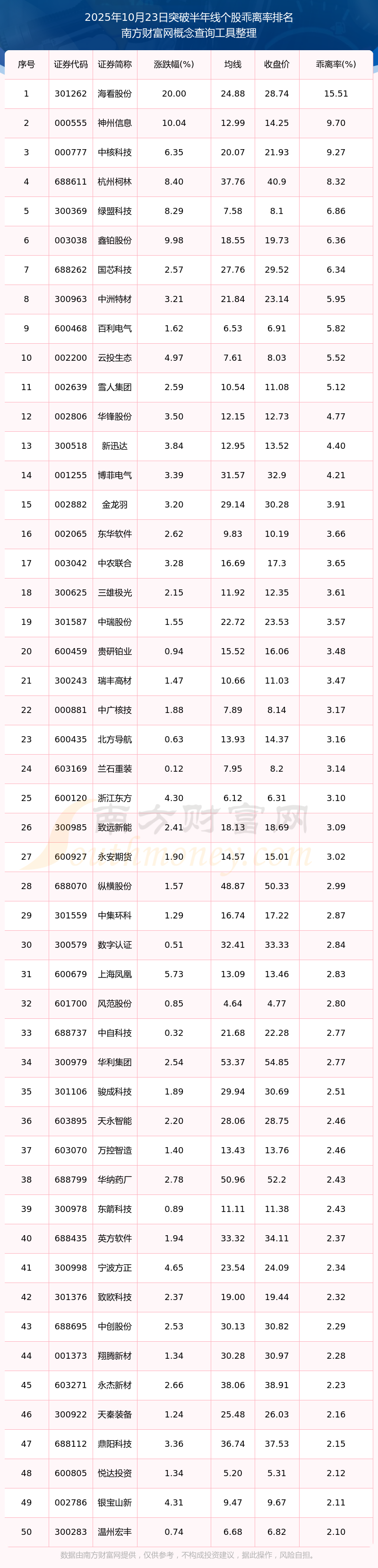 2025年10月23日突破120日線個(gè)股乖離率排名