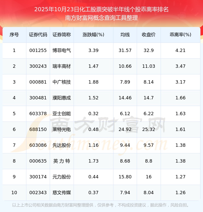 2025年10月23日化工股票突破半年線個(gè)股乖離率排名