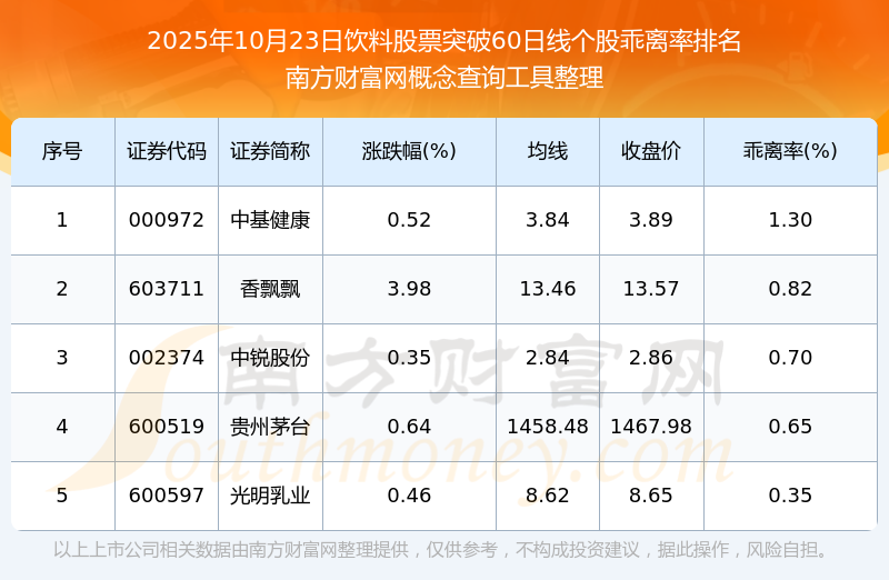 根據(jù)南方財富網(wǎng)概念查詢工具數(shù)據(jù)統(tǒng)計,截止2025年10月23日收盤,飲料股票共有5只個股收盤價向上突破了60日線。其中乖離率較大的個股有中基健康、香飄飄、中銳股份等,乖離率分別為1.30%、0.82%、0.70%。