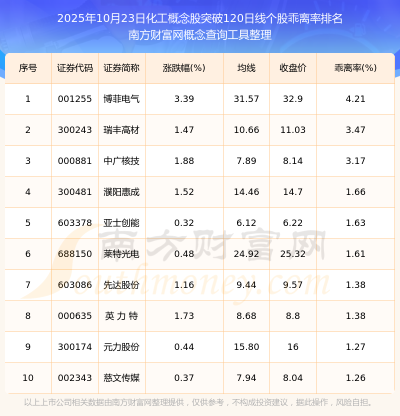 2025年10月23日化工概念股突破120日線個(gè)股乖離率排名