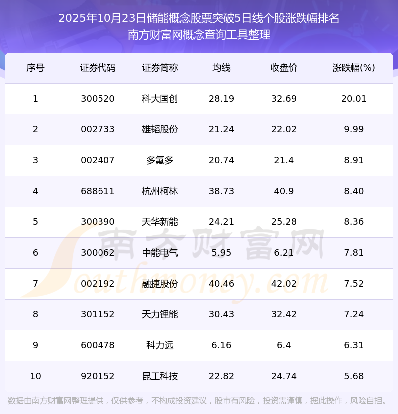2025年10月23日儲(chǔ)能概念股票突破5日線個(gè)股漲跌幅排名