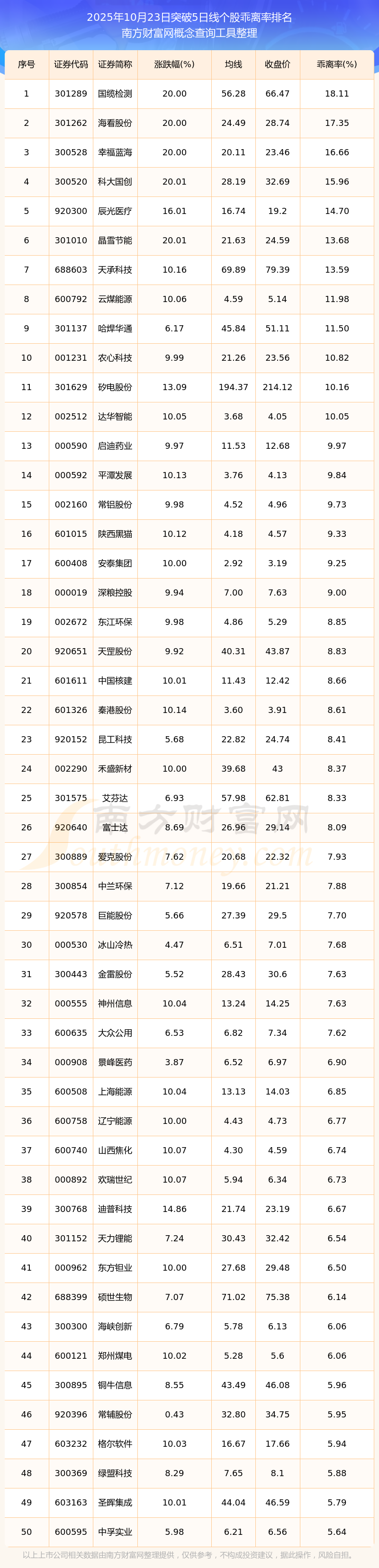 根據(jù)南方財富網(wǎng)概念查詢工具數(shù)據(jù)統(tǒng)計,截止2025年10月23日收盤,共有1400只個股收盤價向上突破了5日線,其中乖離率較大的個股有國纜檢測、?垂煞荨⑿腋K{海、科大國創(chuàng)、辰光醫(yī)療等,乖離率分別為18.11%、17.35%、16.66%、15.96%、14.70%。
