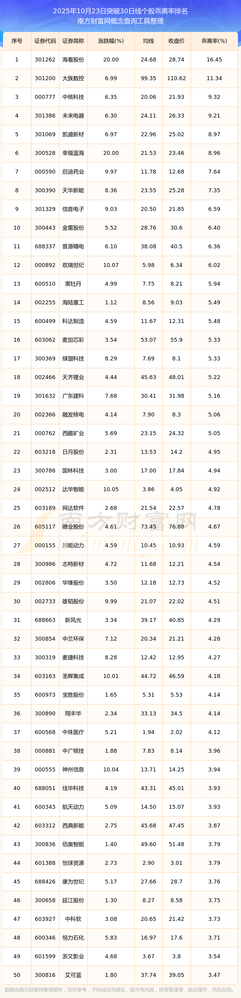 根據(jù)南方財富網(wǎng)概念查詢工具數(shù)據(jù)統(tǒng)計,截止2025年10月23日收盤,共有514只個股收盤價向上突破了30日線,其中乖離率較大的個股有?垂煞、大族數(shù)控、中核科技、未來電器、凱盛新材等,乖離率分別為16.45%、11.34%、9.32%、9.21%、8.97%。