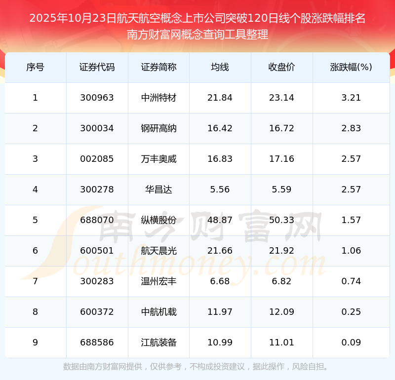 根據(jù)南方財富網(wǎng)概念查詢工具數(shù)據(jù)統(tǒng)計,截止2025年10月23日收盤,航天航空概念上市公司共有9只個股收盤價向上突破了120日線。其中漲幅較大的個股有中洲特材、鋼研高納、萬豐奧威等,漲幅分別為3.21%、2.83%、2.57%。