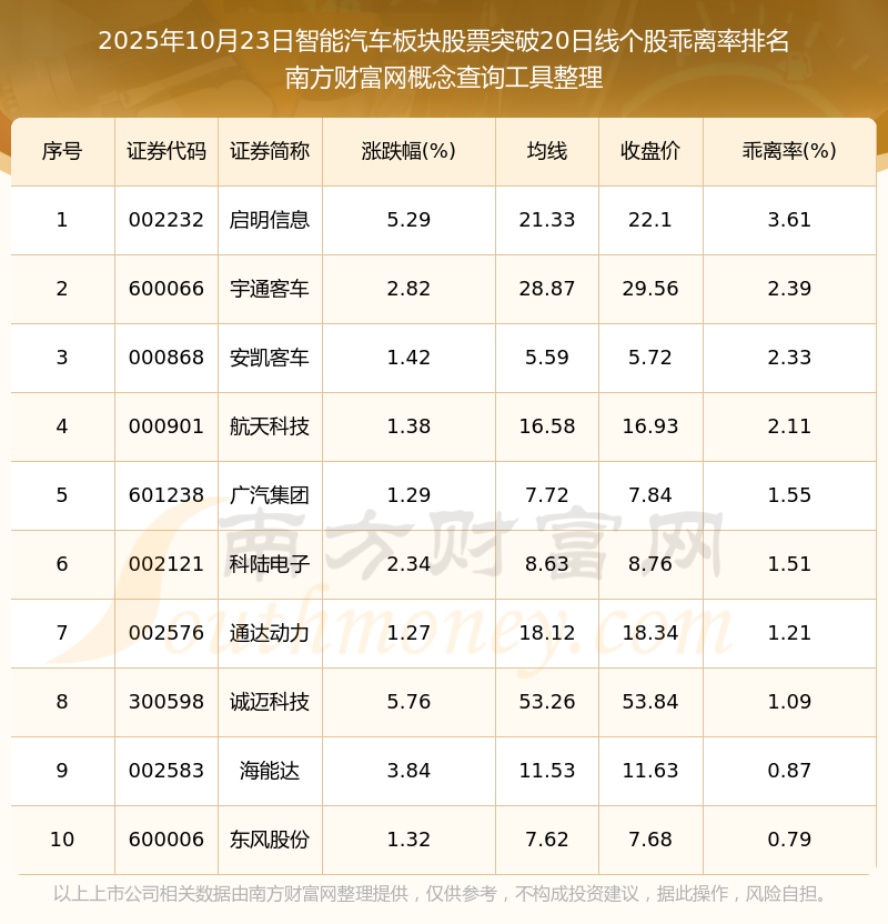 根據(jù)南方財(cái)富網(wǎng)概念查詢工具數(shù)據(jù)統(tǒng)計(jì),截止2025年10月23日收盤,智能汽車板塊股票共有15只個(gè)股收盤價(jià)向上突破了20日線。其中乖離率較大的個(gè)股有啟明信息、宇通客車、安凱客車等,乖離率分別為3.61%、2.39%、2.33%。
