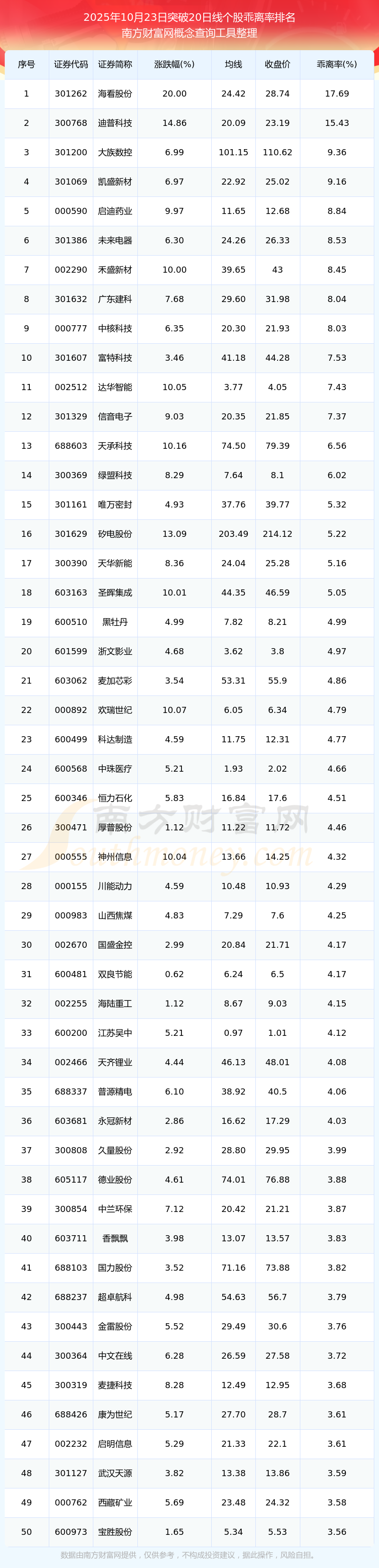 2025年10月23日突破20日線個(gè)股乖離率排名