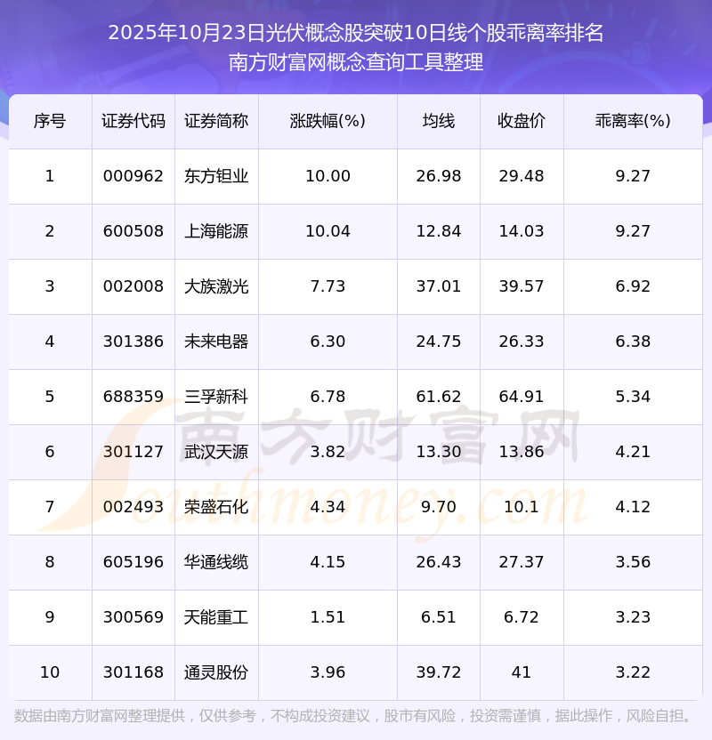 2025年10月23日光伏概念股突破10日線個股乖離率排名