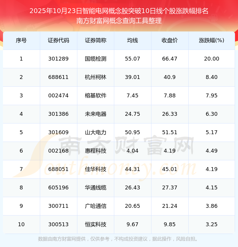 2025年10月23日智能電網(wǎng)概念股突破10日線個股漲跌幅排名