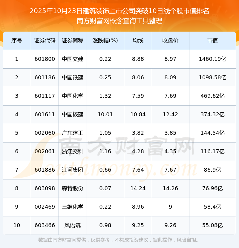 2025年10月23日建筑裝飾上市公司突破10日線個股市值排名