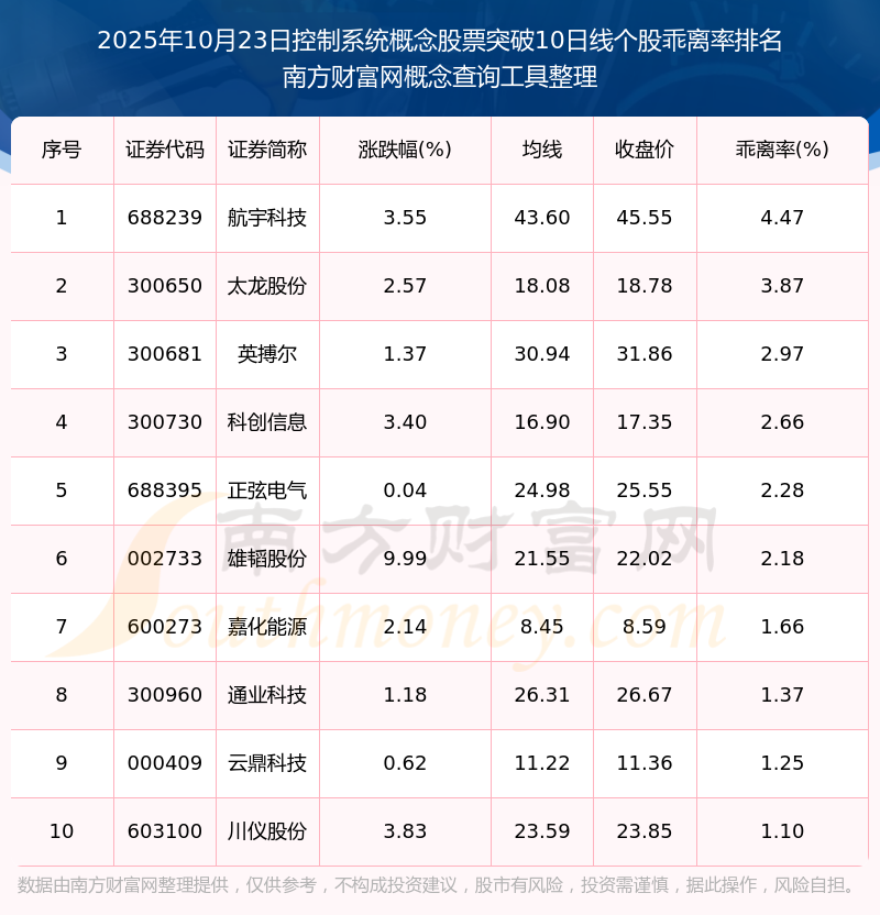 2025年10月23日控制系統(tǒng)概念股票突破10日線個(gè)股乖離率排名