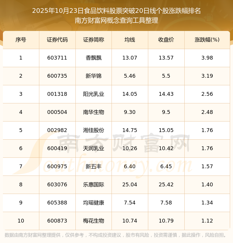 2025年10月23日食品飲料股票突破20日線個(gè)股漲跌幅排名