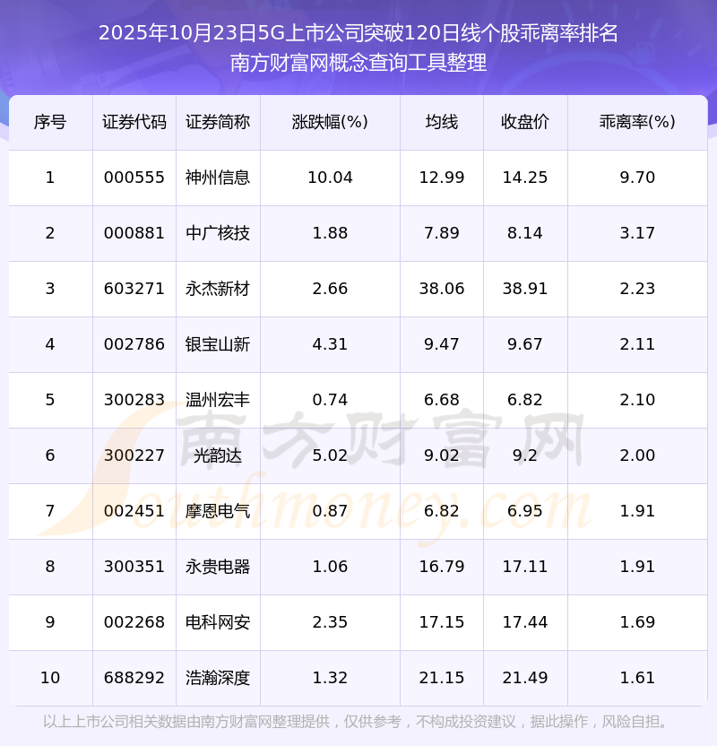 2025年10月23日5G上市公司突破120日線個(gè)股乖離率排名